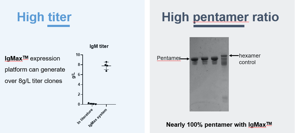 在IgM平台和鼻喷制剂平台的加持下,汉腾生物成功完成新冠IgM鼻喷制剂产品的CMC开发。汉腾生物IgM平台具有高产量特征,经改良的细胞株产量最高可达8g/L,并且生产的五聚体(IgM)比例可高达100%,几乎无六聚体产生,减少工艺开发难度,助力新冠IgM鼻喷制剂的高质量研发。