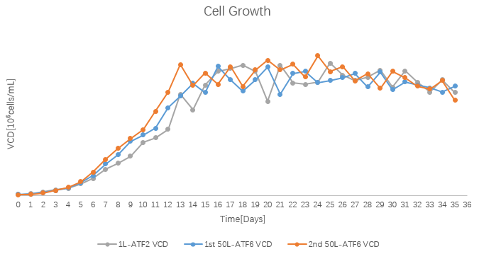 汉腾生物已建立了成熟的灌流工艺平台,能够实现1L至200L规模的灌流工艺开发及生产。本案例中,通过对早期开发数据的分析,顺利的在同规模(1L)实现工艺重复及确认,并成功放大至50L生产规模,成功帮助客户完成了灌流工艺项目的引入及生产。